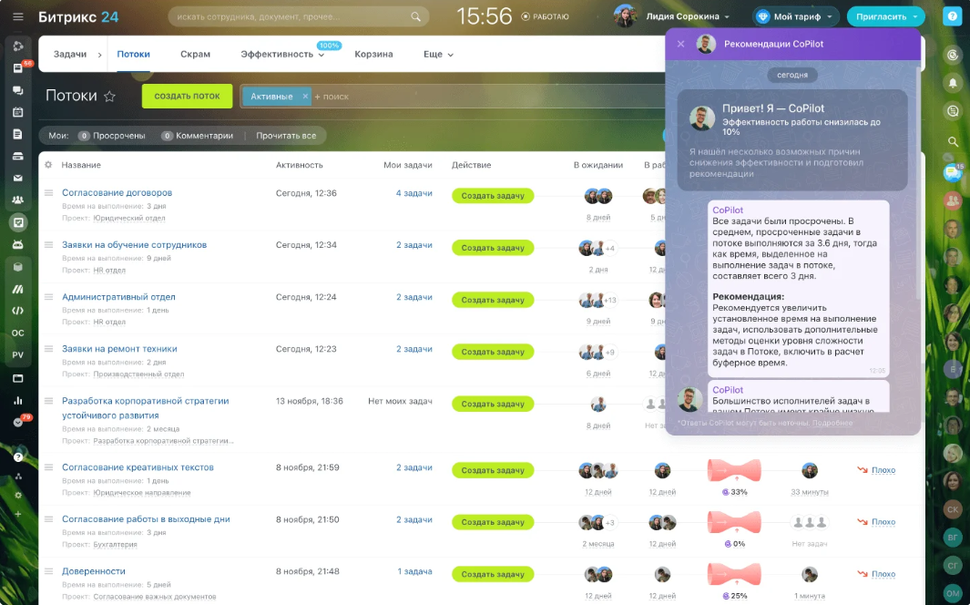 Битрикс24 Потоки — это очереди типовых задач. Инструмент помогает организовать работу бэк-офиса, например, административно-хозяйственного и юридического отделов.
