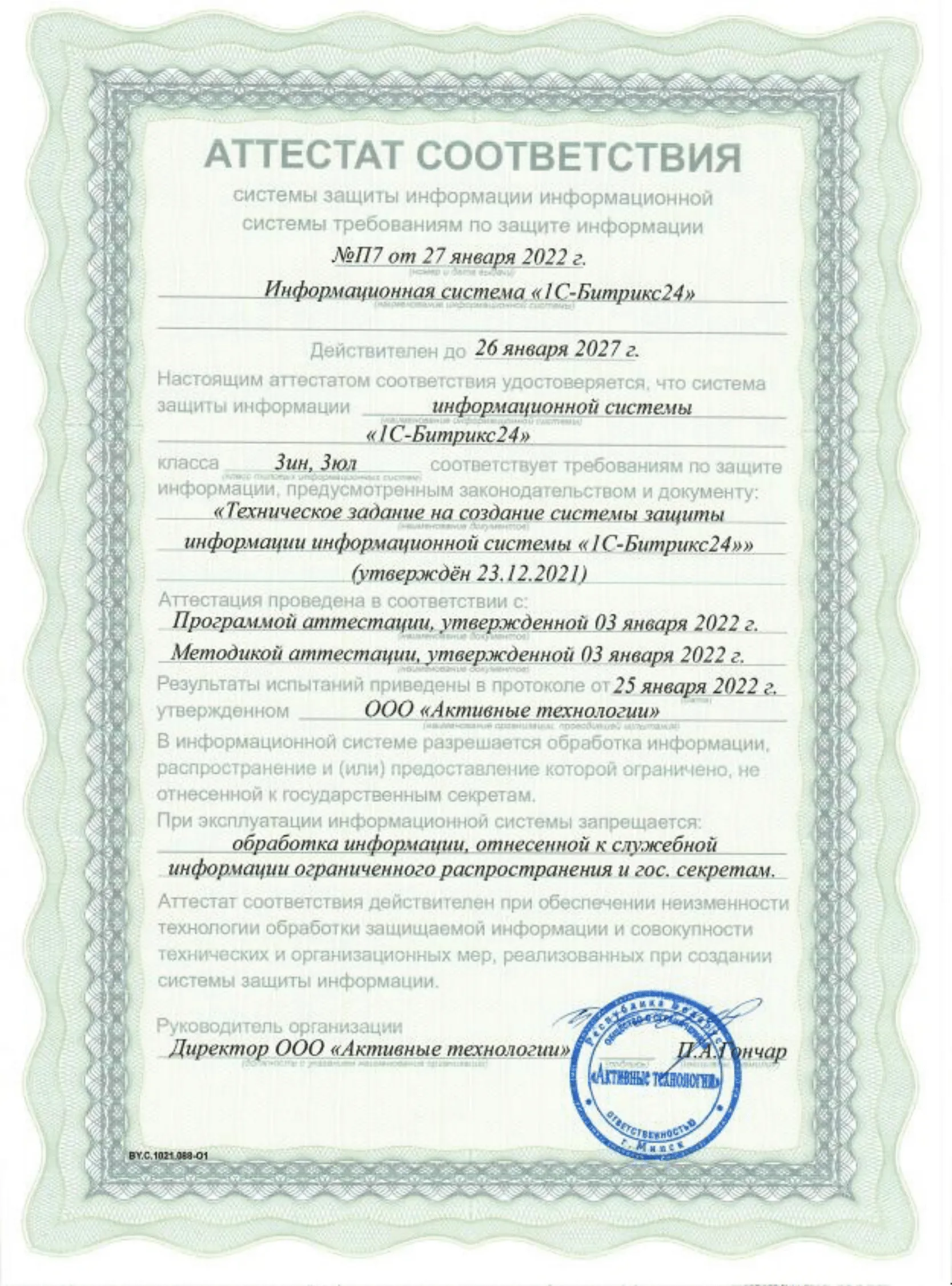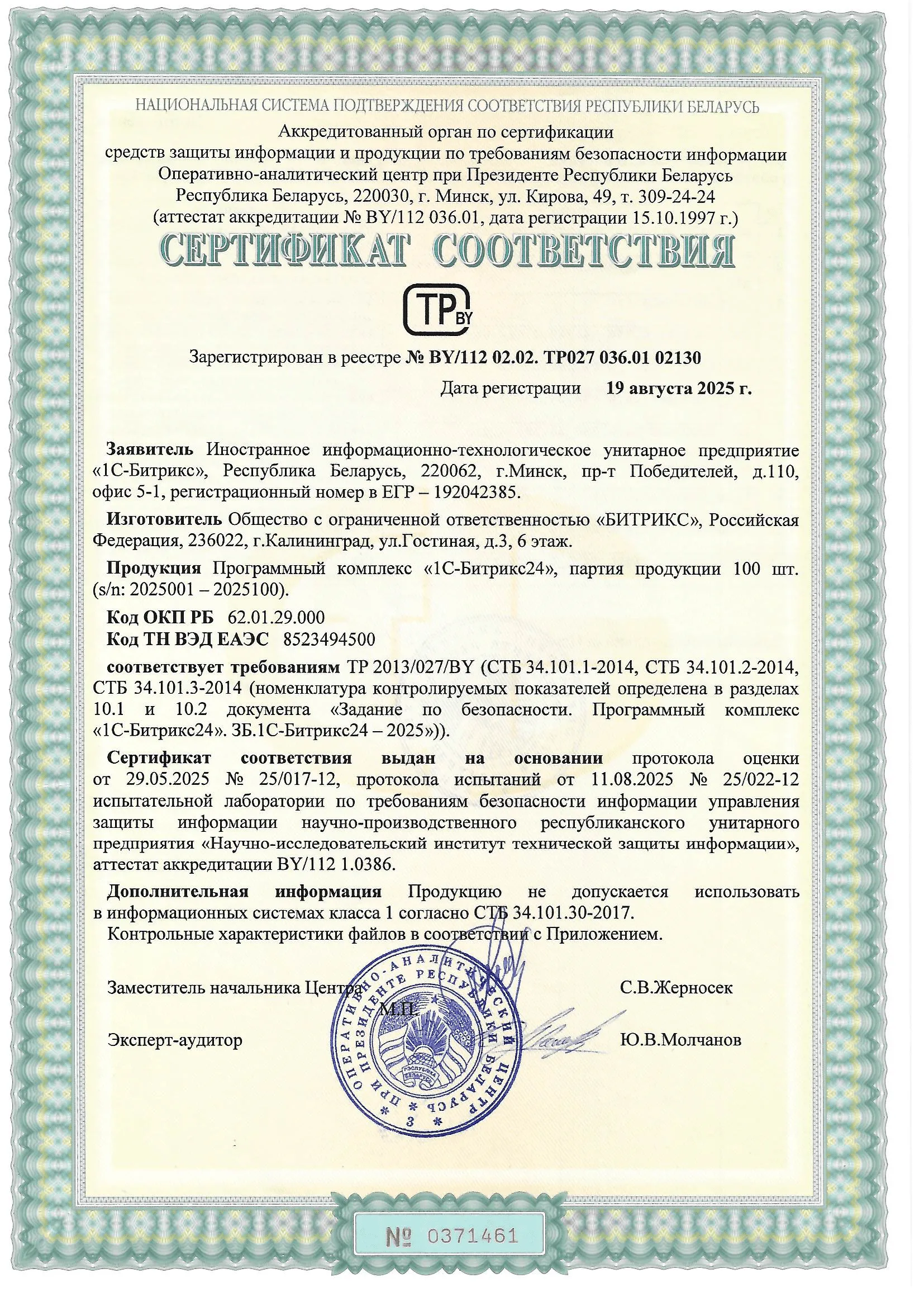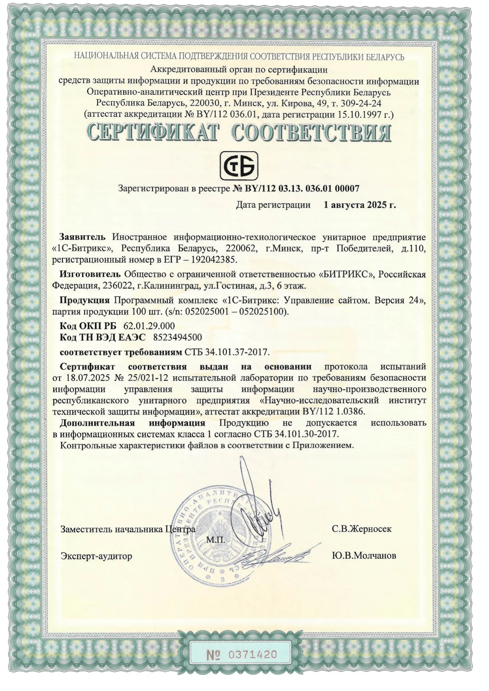 Получение Сертификатов соответствия подтверждает стратегический курс компании «1С-Битрикс» на развитие безопасных и надёжных решений для государственных и коммерческих организаций Республики Беларусь.