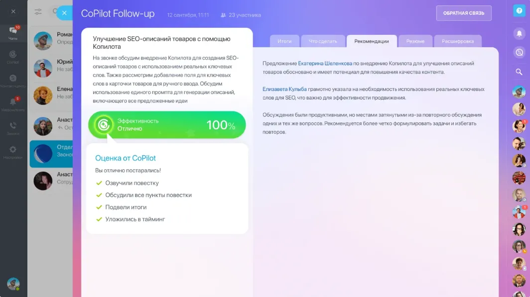 CoPilot Follow-up помогает сделать синки еще полезнее. CoPilot также показывает эффективность встречи в процентах и сообщает в конце, какие предложения ему показались лучшими. В придачу он делится советами, как сделать следующую встречу продуктивнее. Кроме того, CoPilot готовит расшифровку звонка и резюме с временными метками.