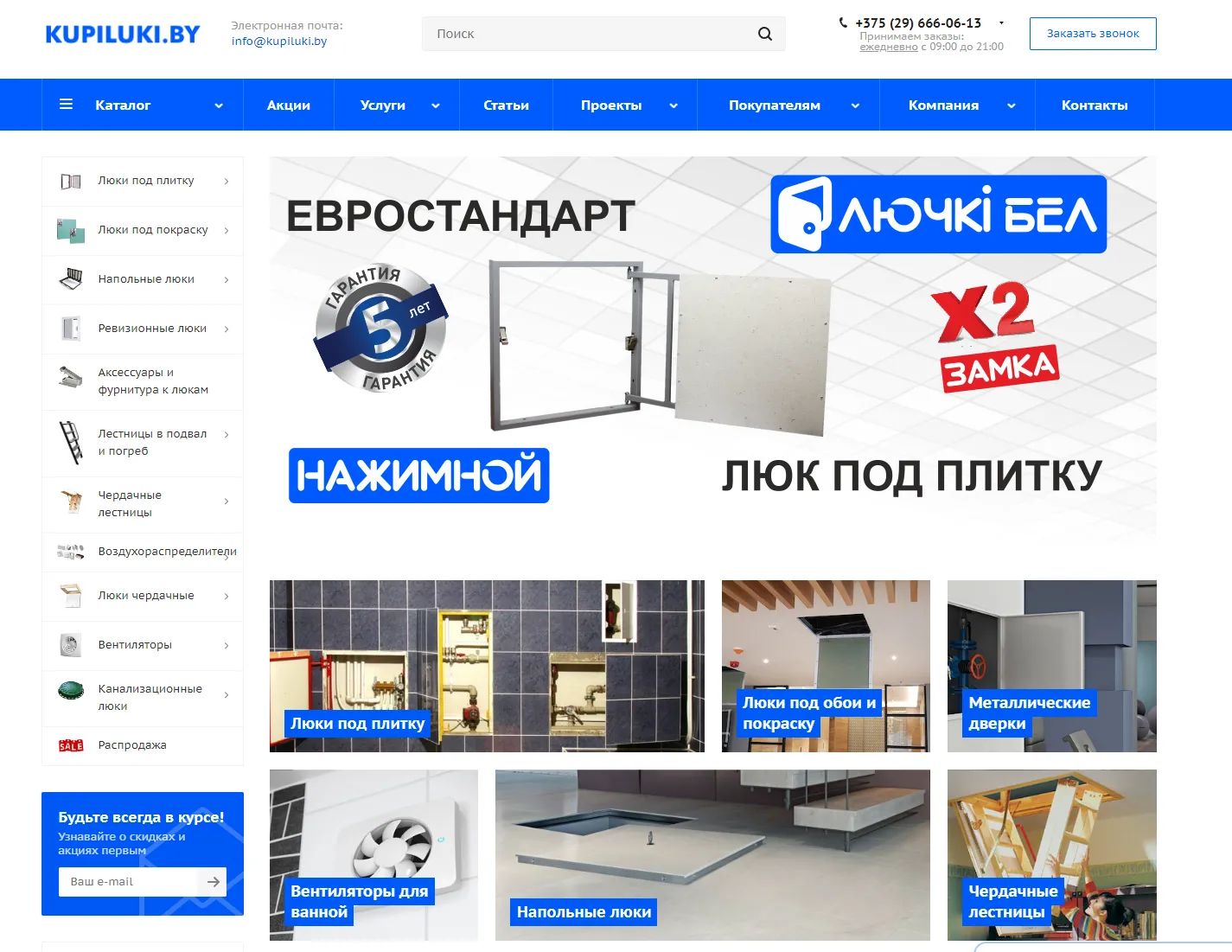 Люки-невидимки от первого импортёра и производителя. Компания ООО "Скрытые технологии" официальный дистрибьютор торговой марки Revizor. В каталоге магазина KUPILUKI.BY вы можете ознакомиться с ассортиментом разных производителей, как импортируемых так и производства РБ.
